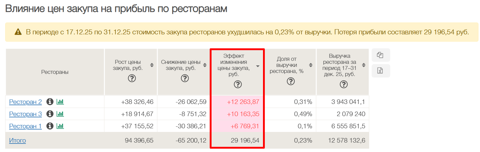 Пример № 1. Отчет «Анализ изменения закупочных цен»: влияние цен закупа на прибыль по ресторанам.