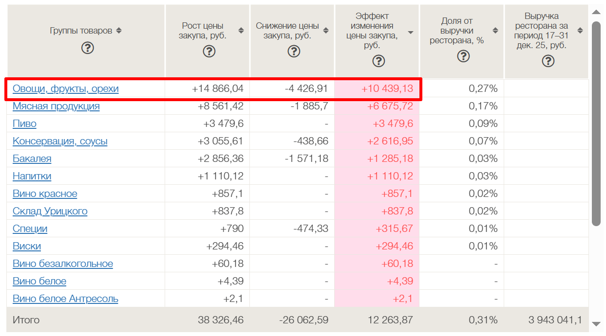 На примере видно, что в группе «Овощи, фрукты, орехи» он составил + 14 866,04 руб., в то время как снижение только - 4 426,91., таким образом, эффект изменения цены закупа за рассматриваемый период составил + 10 439,13 руб.