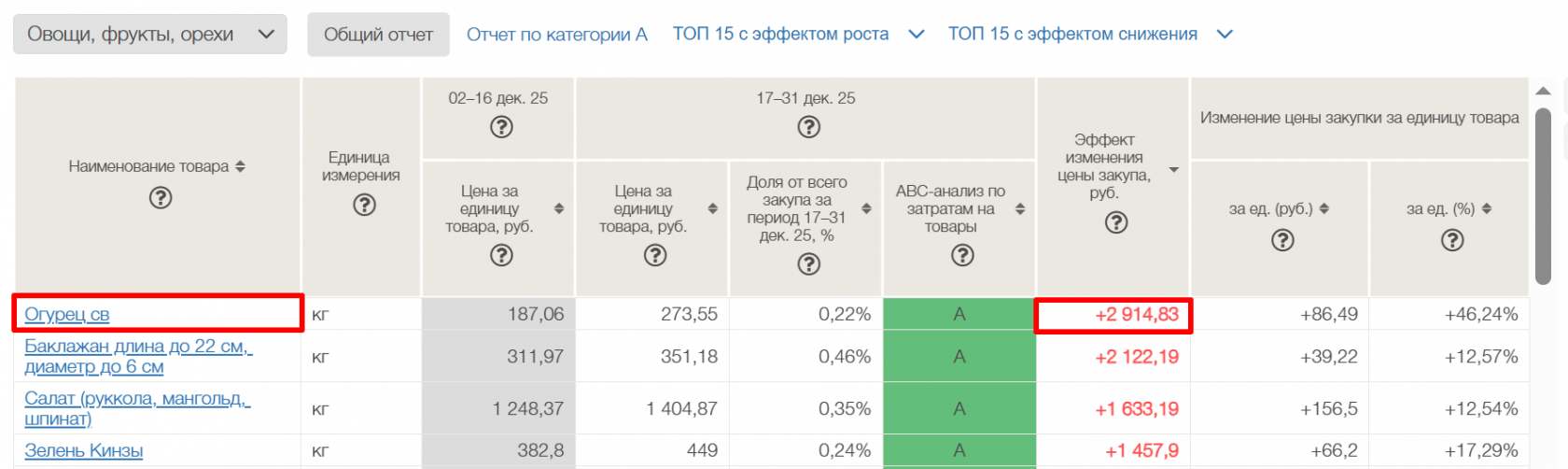 Таким образом, в группе «Овощи, фрукты, орехи» по позиции «Огурец св» эффект изменения цены составил +2 914,83 руб. при росте цены за единицу на 46%.