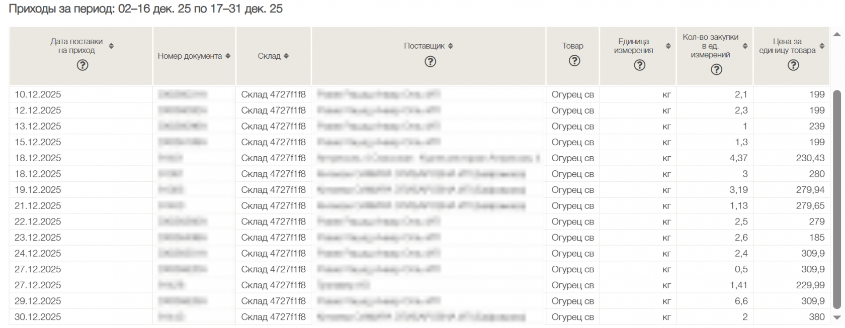 Пример № 4. Отчет “Анализ изменения закупочных цен”: приходы за период.