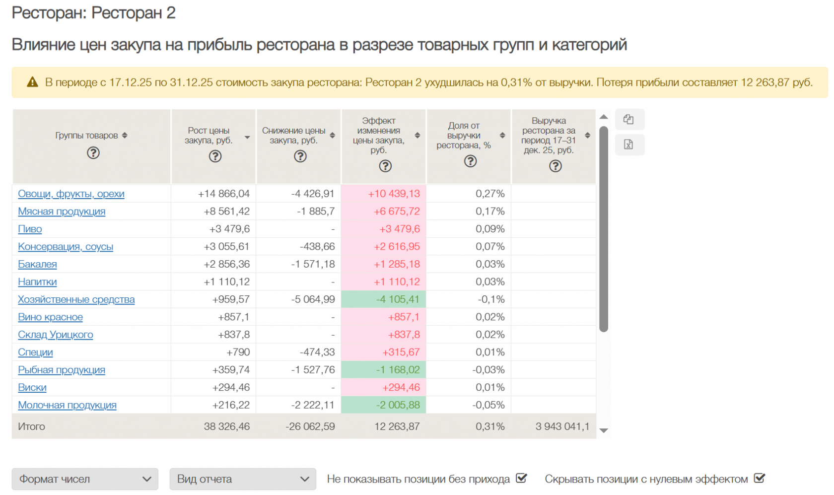 По умолчанию в отчёте отображаются только те товары, у которых наблюдается ненулевой эффект от изменения закупочной цены. Если цена прихода в текущем периоде совпадает с ценой прихода в периоде сравнения, эффект изменения равен нулю — и такой товар не попадает в отчёт.