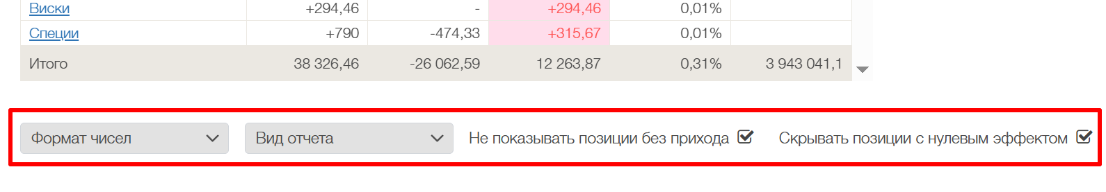 Особое внимание хотелось бы уделить фильтрам "Не показывать позиции без прихода" и "Скрывать позиции с нулевым эффектом".