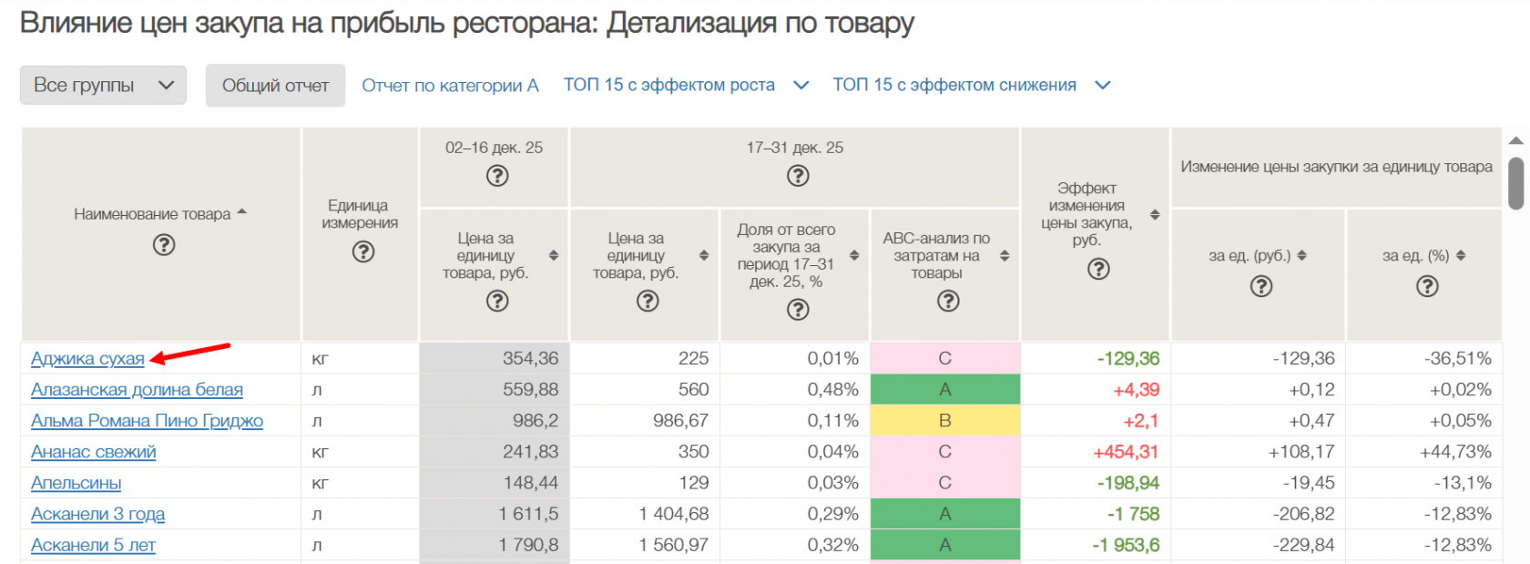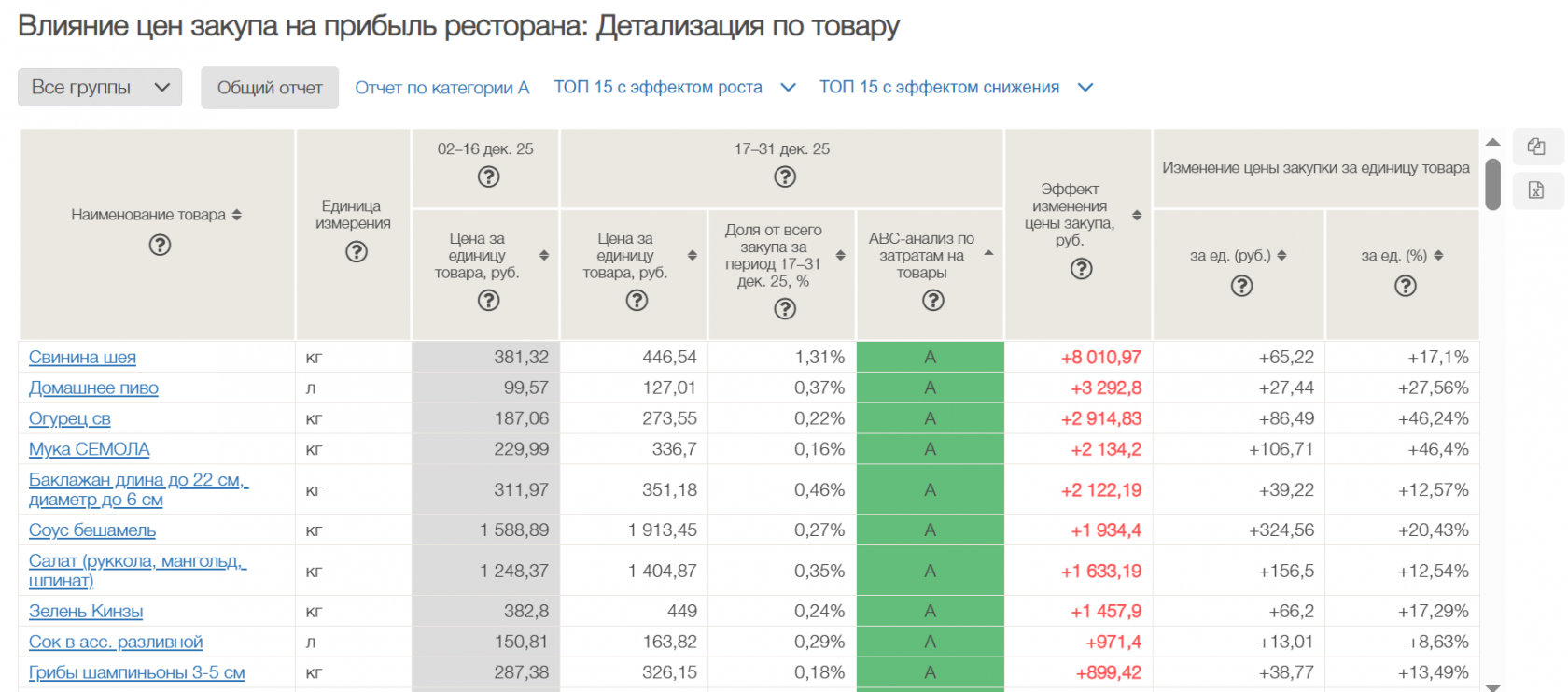 Совместно с общим отчетом мы также можем проследить динамику топ 15 товаров с эффектом роста закупа и с эффектом снижения цены, а также и получить отчет по категории А.