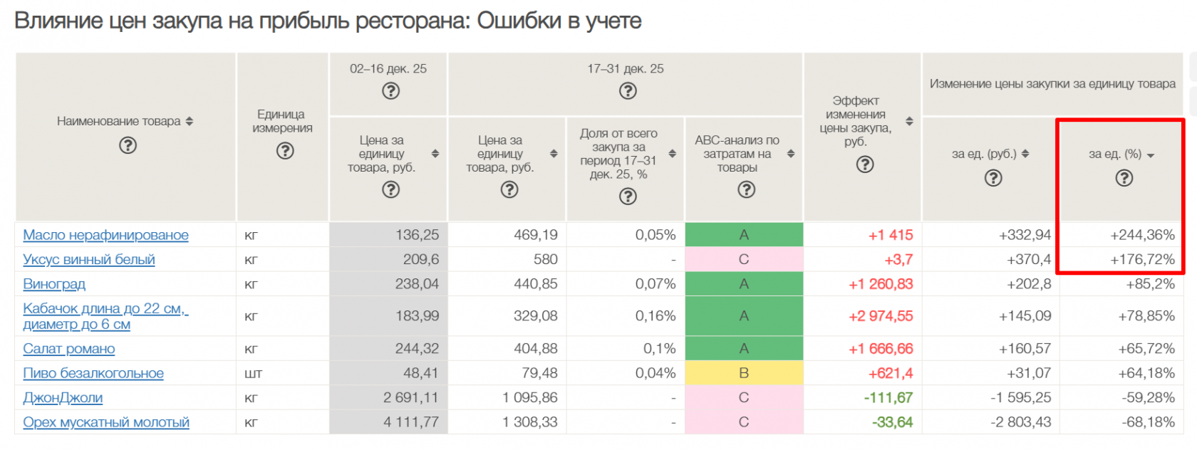 Ранжирование позиций по принципу АBС анализа позволяет быстро определить, насколько критично для компании изменение цены на конкретный товар в рамках всего закупа за период.