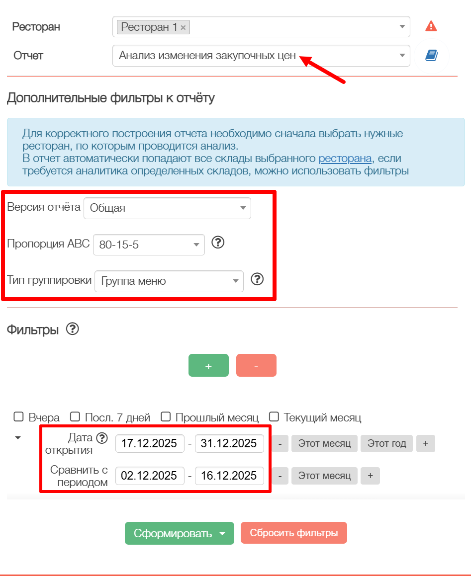 1. Для построения выбираем необходимые заведения и отчет “Анализ изменения закупочных цен”;