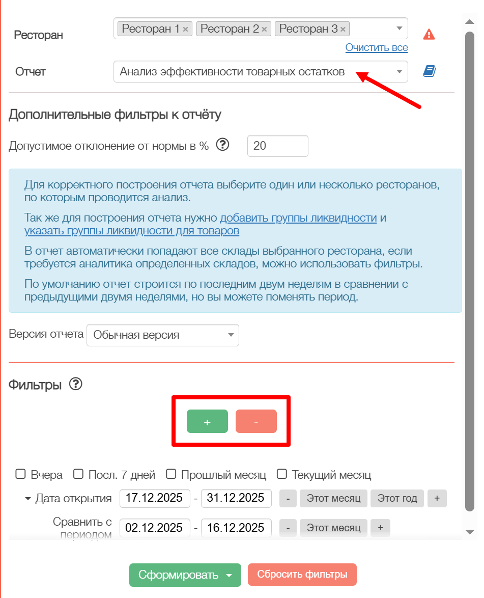 4. Через фильтр включения (зелёный плюс) или исключения (красный минус) можно добавить интересующие группировки. Например, сформировать отчет только по конкретному складу, по конкретной группе ликвидности или группе меню;
