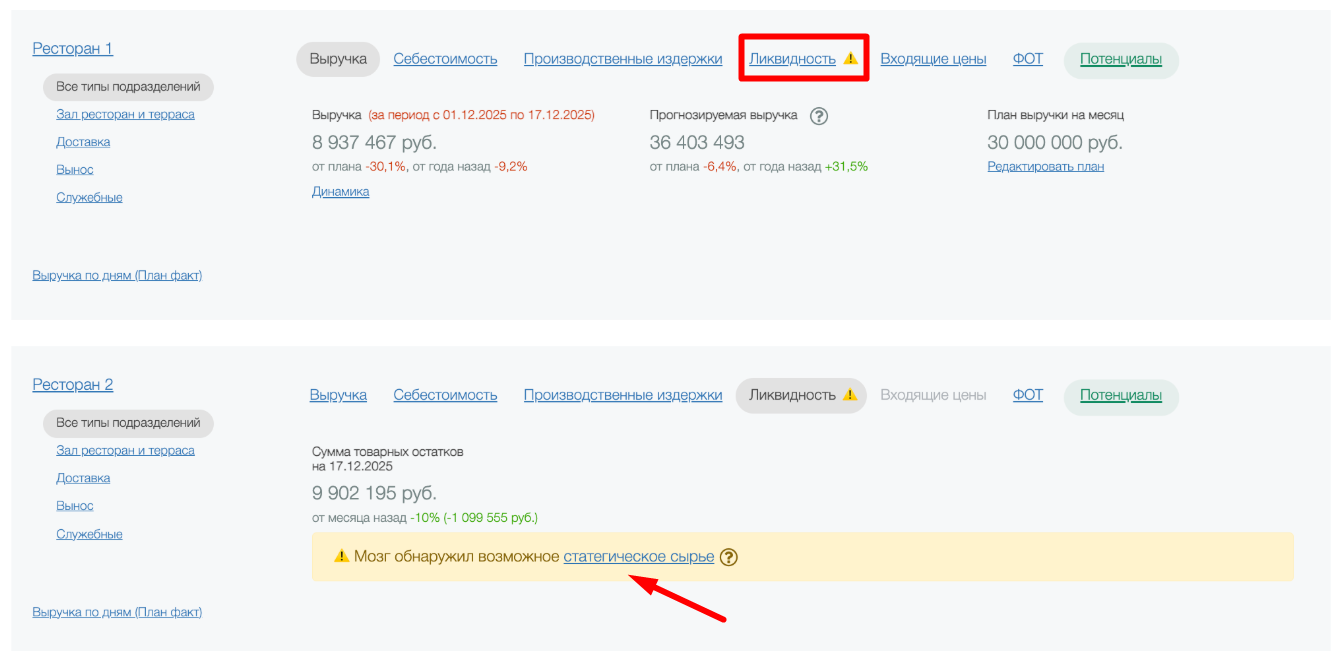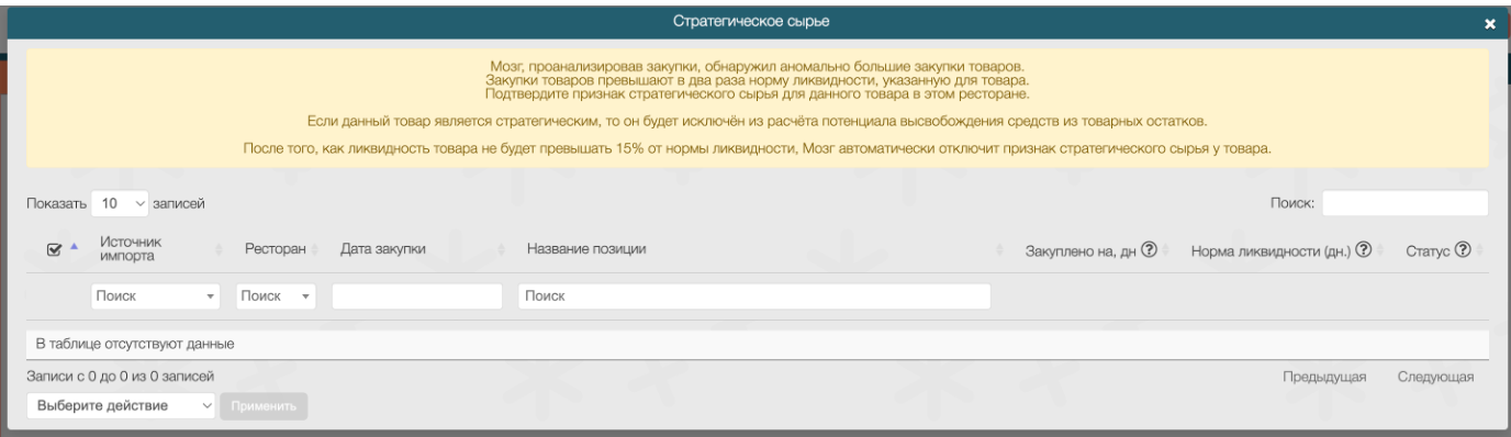 Каждый день Мозг анализирует закупки за последние 14 дней. Если в один из дней объём прихода товара превышает норму его ликвидности в два раза и более, такой товар автоматически помечается статусом «Возможное стратегическое сырьё».