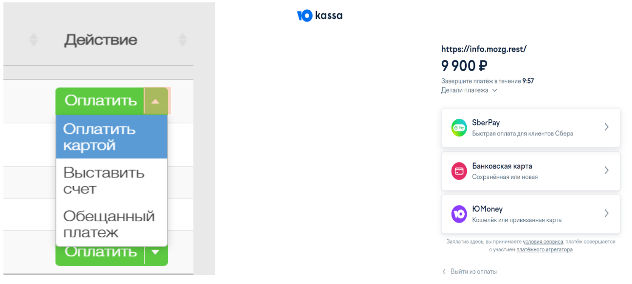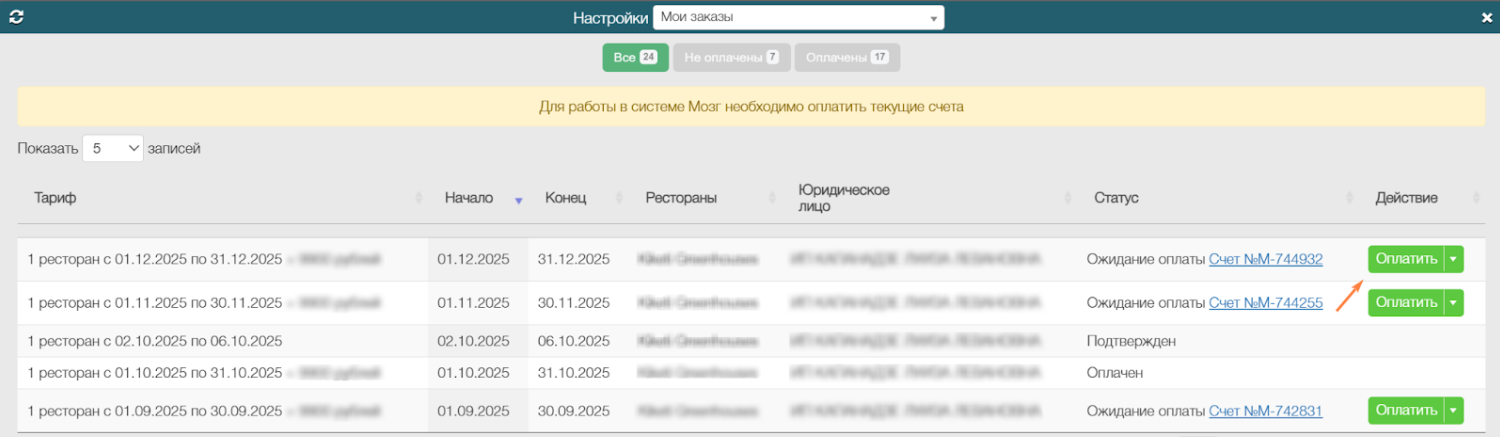 Неоплаченные счета будут отображаться с кнопкой «Оплатить»