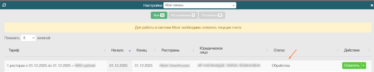 Заведение станет доступно после поступления платежа и статус заказа изменится на «Принят».