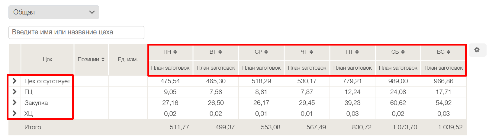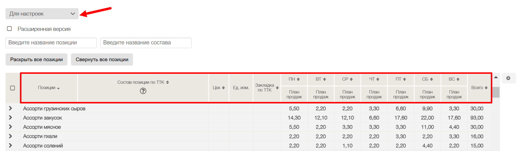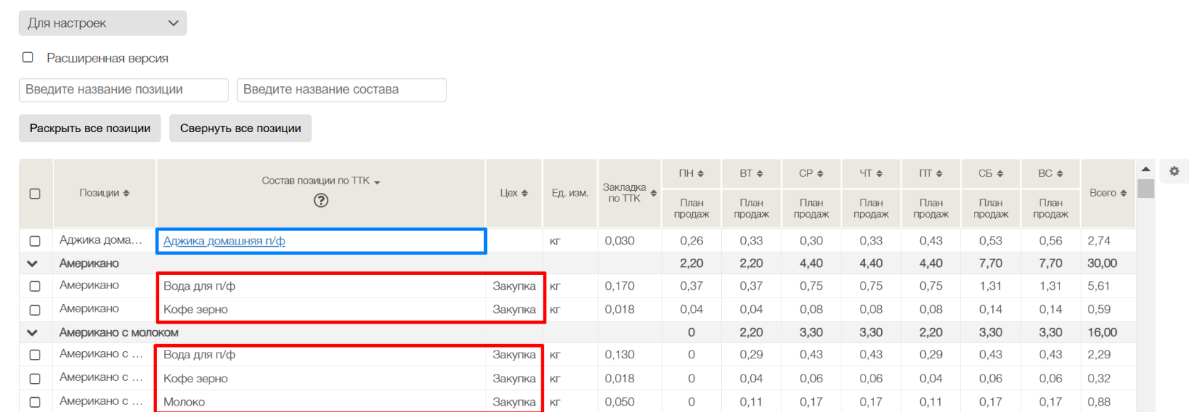 Важно указать цеха для всех позиций, входящих в состав ТТК, чтобы общий отчёт отображался правильно. В версии "Для настроек" выполняется эта настройка.