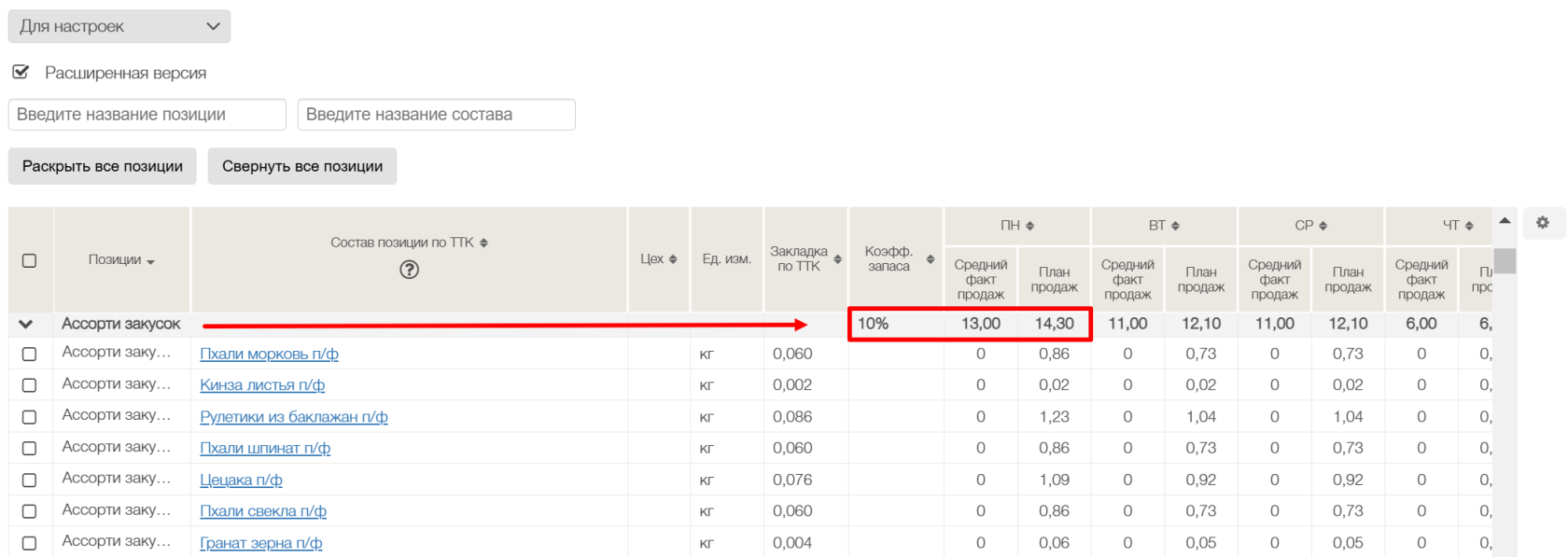 У версии "Для настроек" есть расширенная версия, которая включает два дополнительных показателя: коэффициент запаса и средний факт продаж.