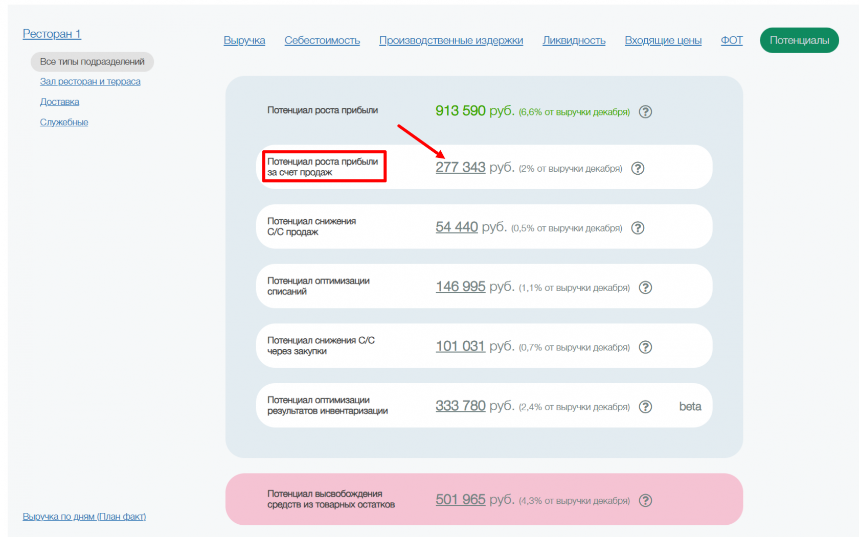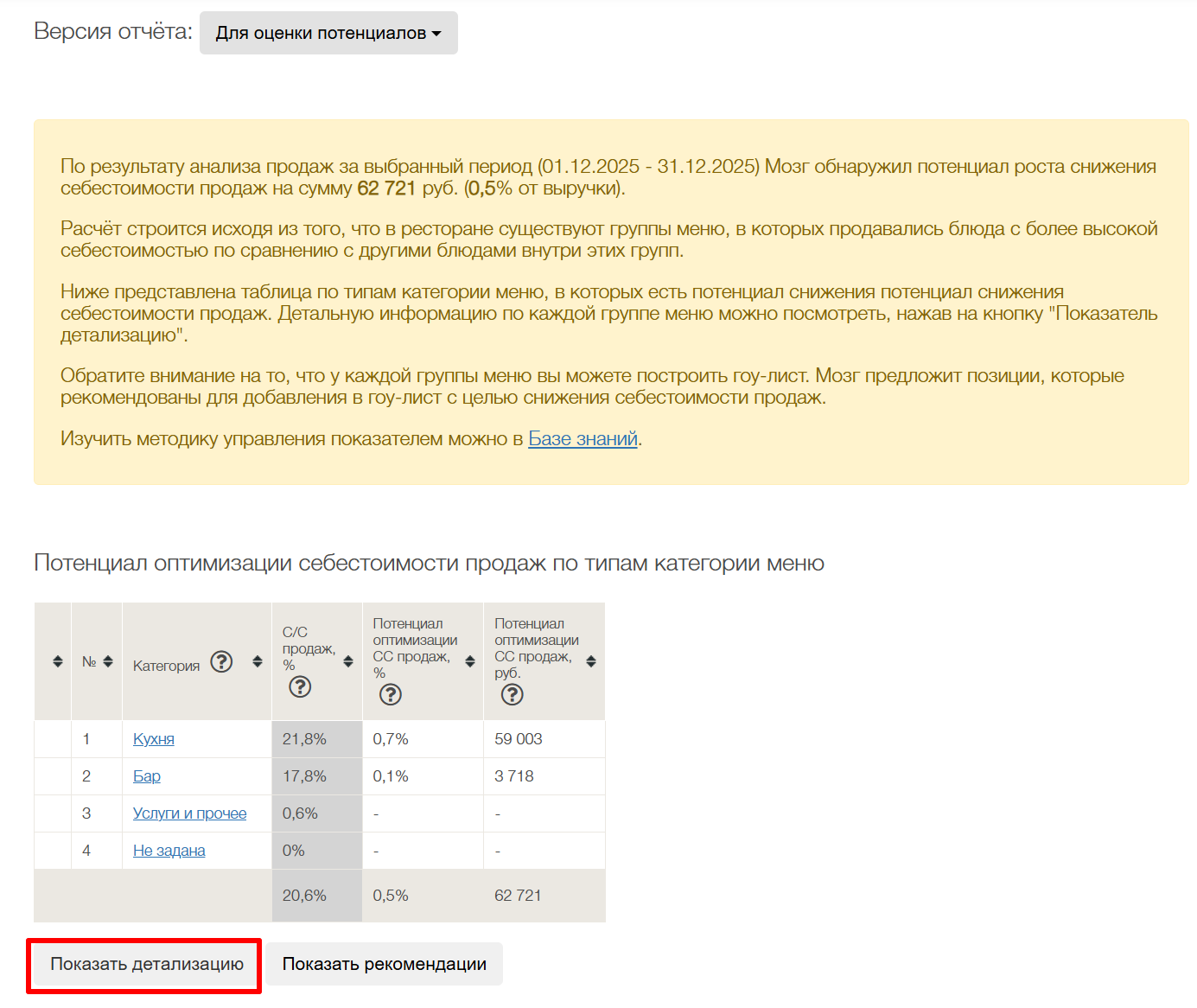Чтобы перейти к гоу-листу, необходимо открыть раздел «Потенциалы», выбрать потенциал «Снижение с/с продаж» и нажать на его значение — после этого откроется новый отчет.