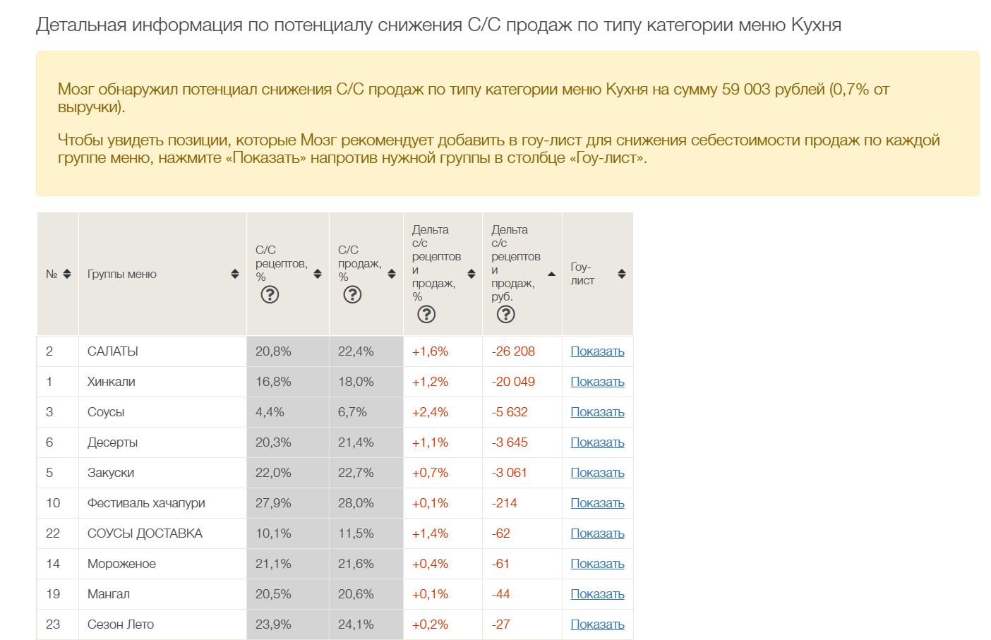 Чтобы увидеть позиции, которые Мозг рекомендует добавить в гоу-лист для снижения себестоимости продаж, необходимо нажать «Показать» напротив нужной группы в столбце «Гоу-лист».