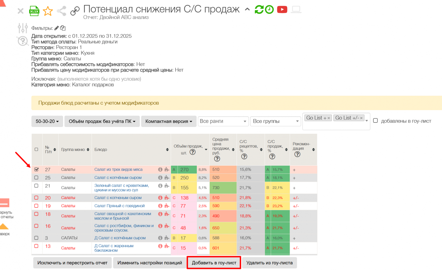 Непосредственная работа с позициями меню происходит в отчете ниже: Мозг автоматически выделяет блюда и напитки, рекомендованные к добавлению в гоу-лист.