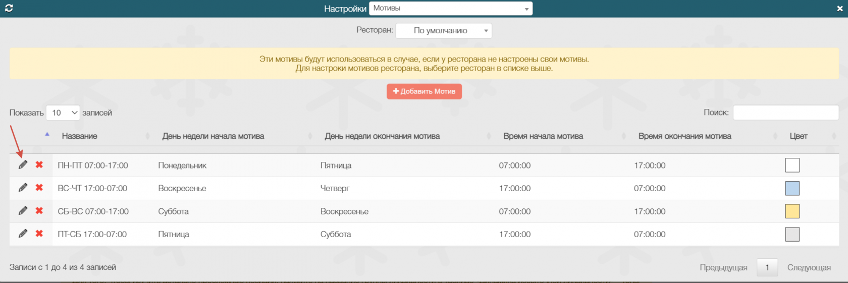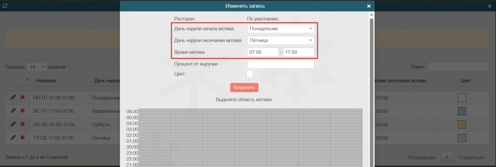 В открывшейся форме внесите изменения по дням недели, если это необходимо, и по времени мотива. Затем нажмите сохранить: