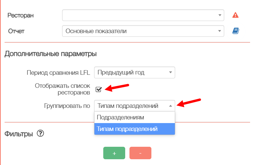2. Если у вас несколько ресторанов, то мы не рекомендуем убирать галочку с "Отображать список ресторанов". Так как если галочку убрать, придется переключаться между ресторанами, вместо того, чтобы видеть информацию в отдельных дашбордах;