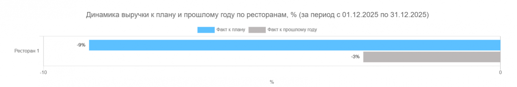 Демонстрирует фактические и плановые значения, а также считает отклонение план/факт выручки, гостей (заказы) и среднего чека по дням. Программный аналог daily-отчету.
