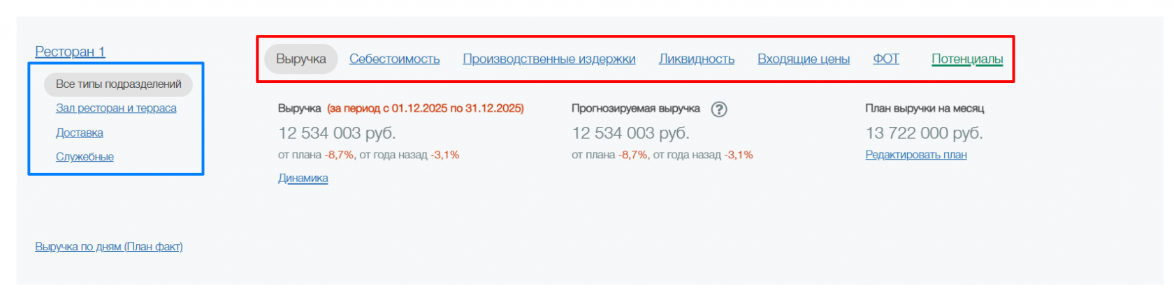 В выделенной части синего цвета вы можете переключаться между типами подразделений (Зал ресторана и терраса, Доставка, Вынос, Служебные), либо выбрать все сразу, нажав на "Все типы подразделений".