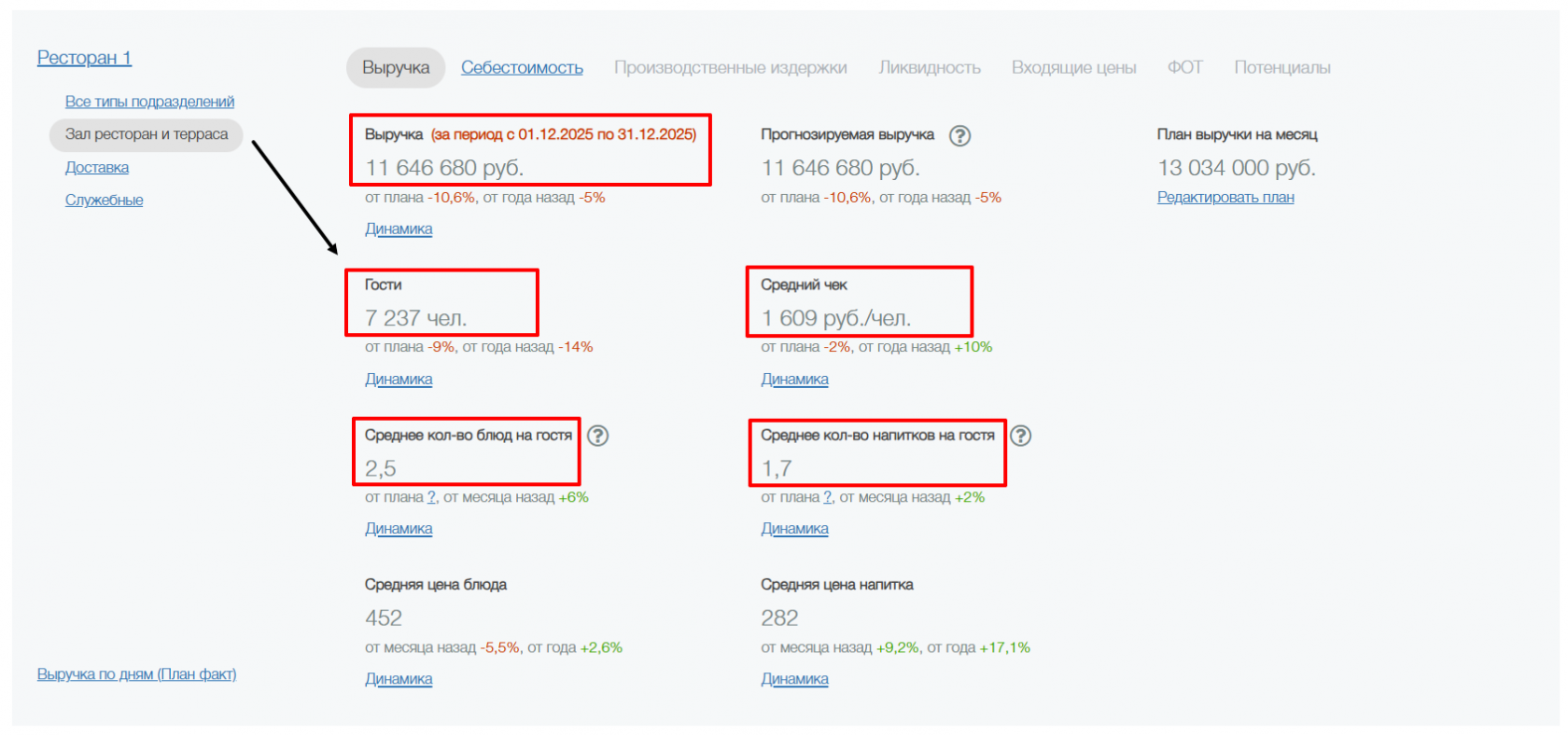 Если переключиться на тип подразделения Зал ресторана и террасам, сможем увидеть показатели по выручке, гостепотоку, среднему чеку и наполняемости. То же самое относится и к подразделениям Доставка и Вынос. Единственное отличие — в этих подразделениях отображается количество заказов, а не количество гостей.