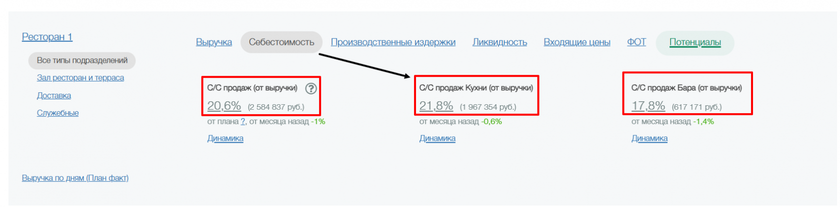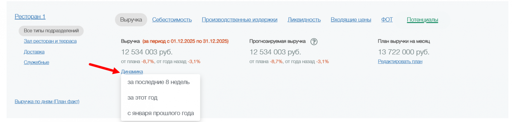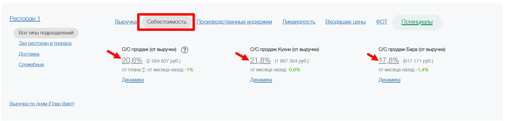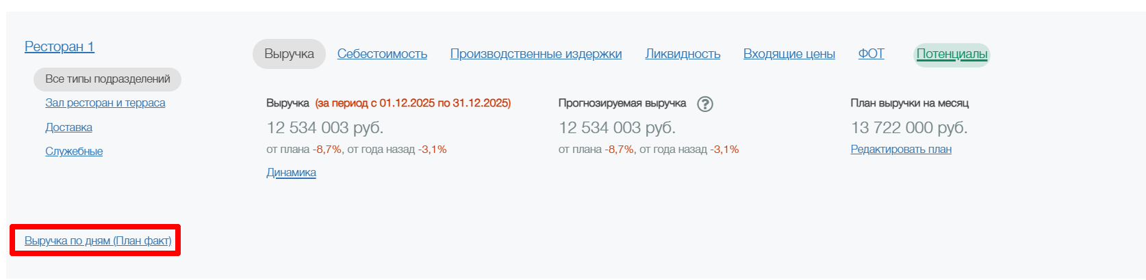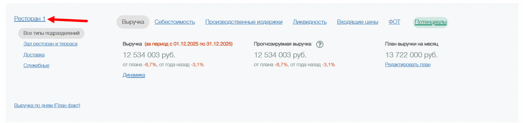 Разделы производственные издержки, ликвидность, входящие цены и ФОТ будут видны только при условии, что у ресторана подключен блок с товарными отчетами и производительностью труда.