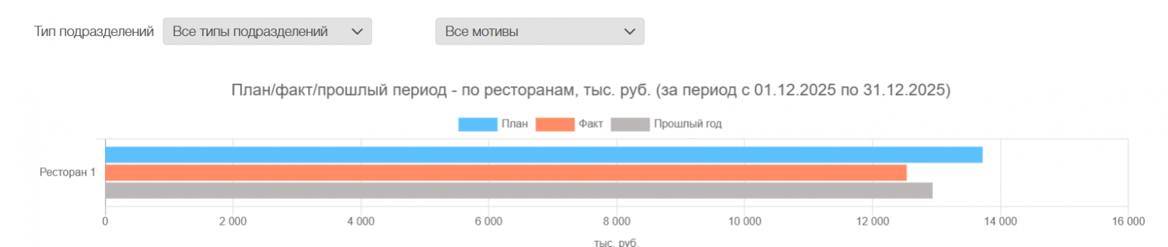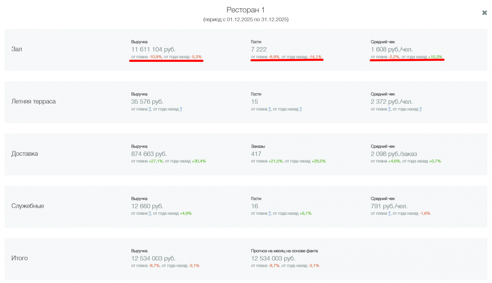 В открывшемся поле будут показаны фактические показатели в разрезе: выручки, гости (или заказы, в зависимости от направления заведения) и средний чек за текущий месяц. Данные предоставляются по каждому подразделению в абсолютных значениях и к ним дополнительно даются процентные отклонения от плана текущего года и прошлого: