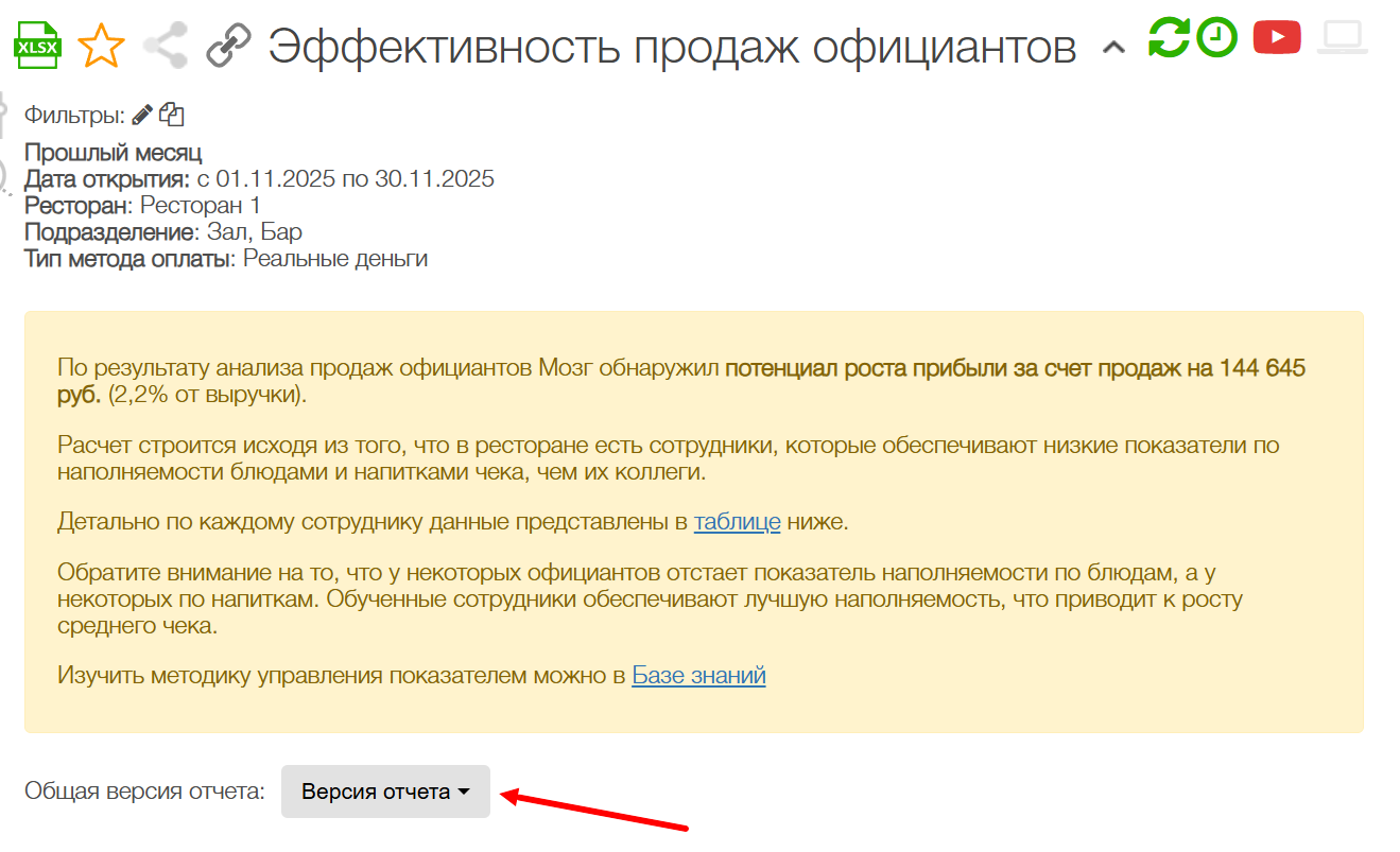 Полная версия отчета подходит для углубленного анализа продаж по официантам. В полной версии можно увидеть следующее: