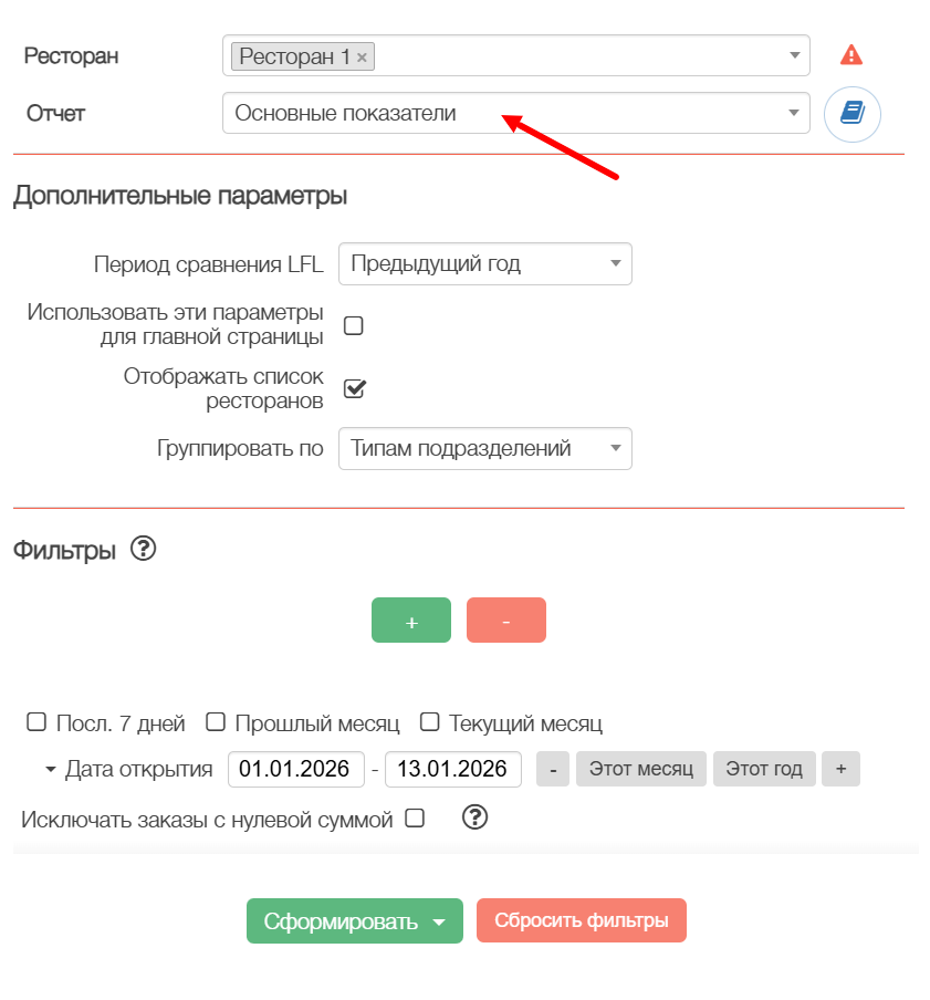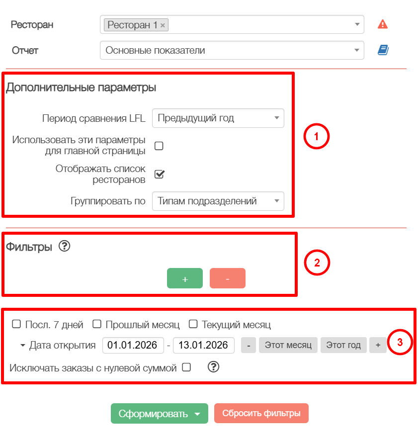 - Поле для выбора дополнительных фильтров: видим фильтр включения и исключения. Через «+» можно проанализировать выручку по определенному подразделению или по конкретной группе меню, столу и т. д. Используя «–», можно исключить из анализа те или иные показатели, которые дает отчет.