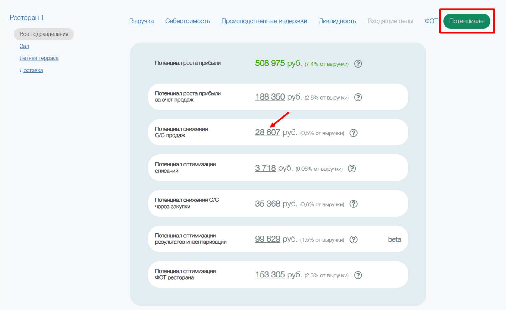 Потенциал снижения с/с продаж — показывает, насколько можно сократить с/с продаж, если продавать высокомаржинальные позиции.