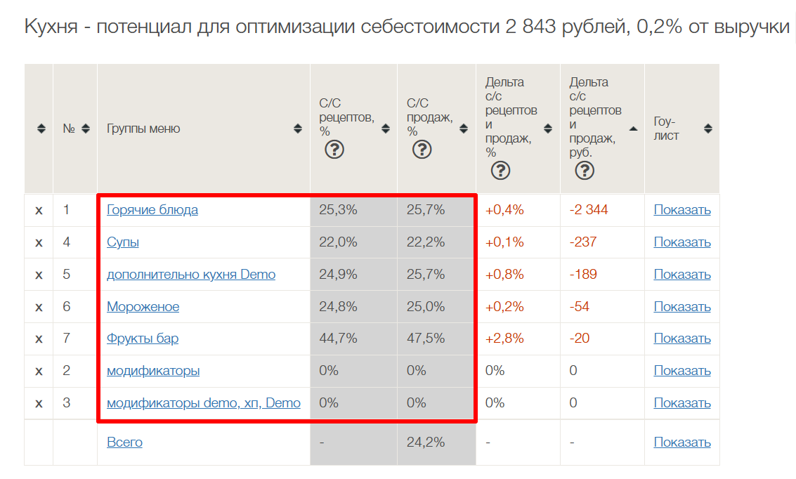 В отчете «Рейтинг категорий и товарных групп» выведены только те группы меню, у которых с/с продаж выше с/с рецептов, что означает, что в группе плохо продаются маржинальные блюда.